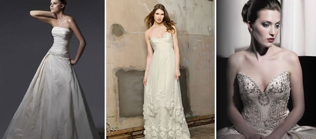 Enzoani “Auburn” Original Price $1000; Sale Price $200 (left); Watters “Jasmine” Original Price $1348; Sale Price $600 (middle); and Stephen Yearick #13158 Original Price $3400; Sale Price $698 (right)